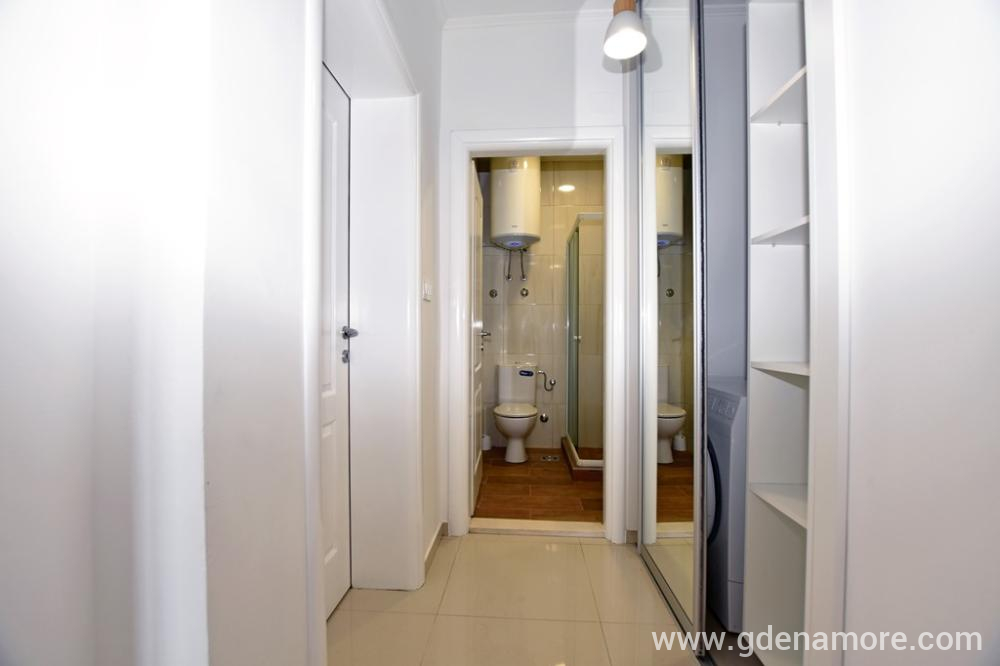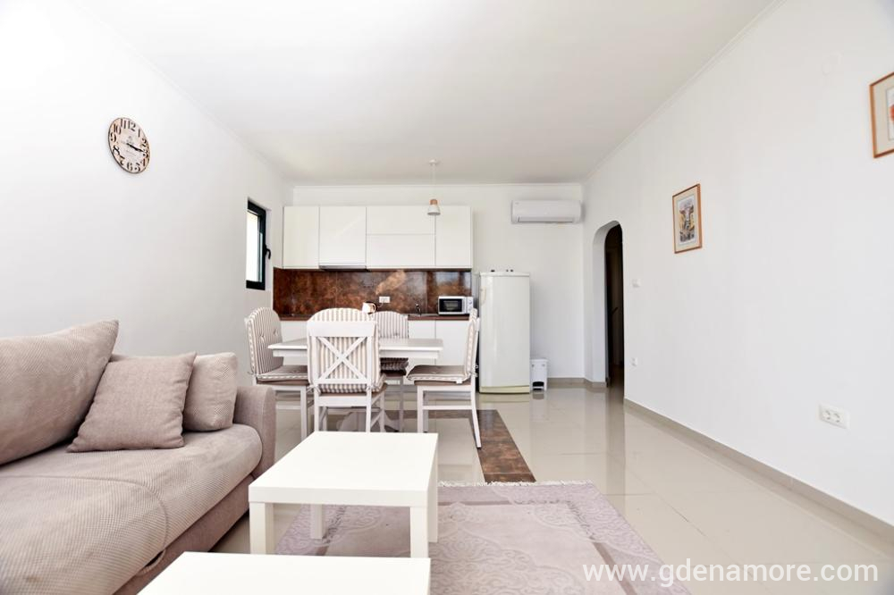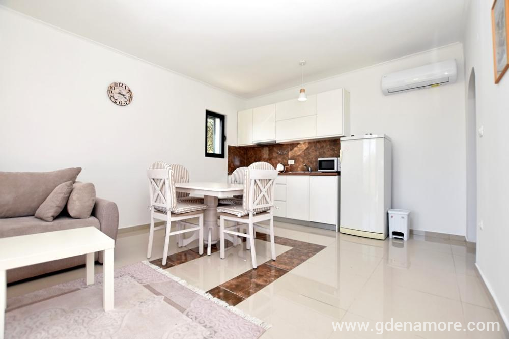 Apartman se nalazi na prvom spratu kuće. Sastoji se od jedne spavaće sobe, kuhinje sa trpezarijom i kupatila. U spavaćoj sobi ima francuski ležaj, što znači da u apartmanu mogu boraviti 2 osobe. Nema dodatni krevet. Terasa ima sto sa 2 stolica , balkon je juzno orijentisan. Imamo sobu za prtljag ...